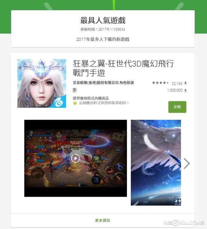 台灣Google Play於今(1)日推出台灣「2017年度最佳」特輯,公佈今年度精選榜單名單,艾肯娛樂旗下所代理運營的3D魔幻飛行戰鬥手遊《狂暴之翼》,分別榮獲年度最佳遊戲中的雙料獎項,包括「最佳對戰遊戲」以及「最具人氣遊戲」,是今年度同時榮獲年度最佳遊戲兩大類別的手機遊戲,在競爭激烈、精彩遊戲百出的遊戲市場中突破異軍,展現狂實力。