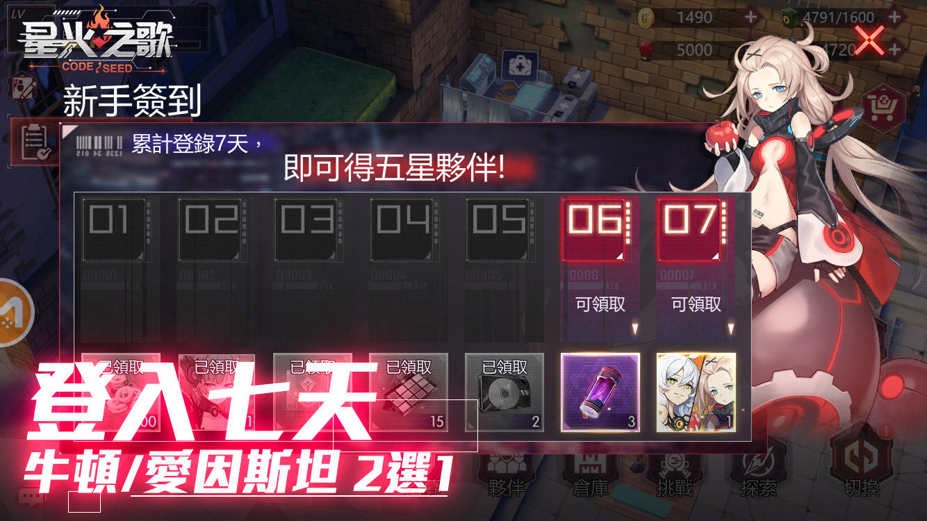 別再說玩遊戲拿不到超強角色!『CODE:SEED星火之歌』的遊戲裡,玩家們只需累計登入滿七天,就可以擁有『5星』角色牛頓、愛因斯坦二選一的機會,再也不用擔心自己總是比不過別人,輔助型的牛頓及攻擊型的愛因斯坦絕對可以成為你的好夥伴。