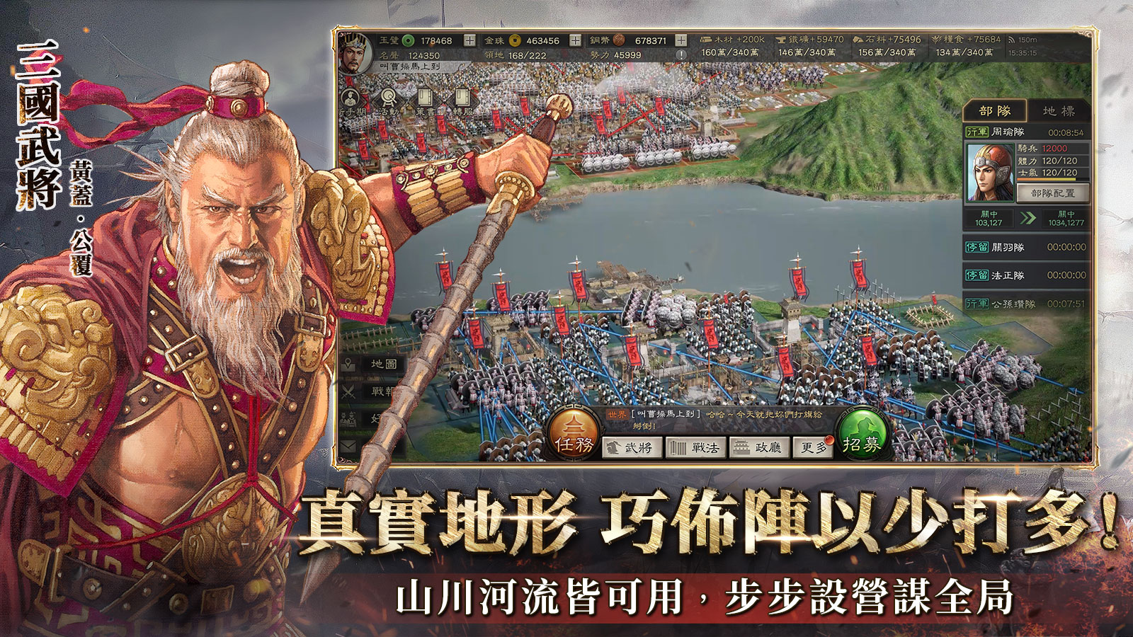 《三國志・戰略版》真實還原古三國的地理原貌,無論是山川、河流、港口與綿延山谷,沒有傳統SLG無視地形規則荒謬行進、強制折返與定點翻地等有違現實的情況,玩家必須要能清楚掌握「地利」要素,才有辦法出奇制勝,輕鬆將敵方一舉殲滅。