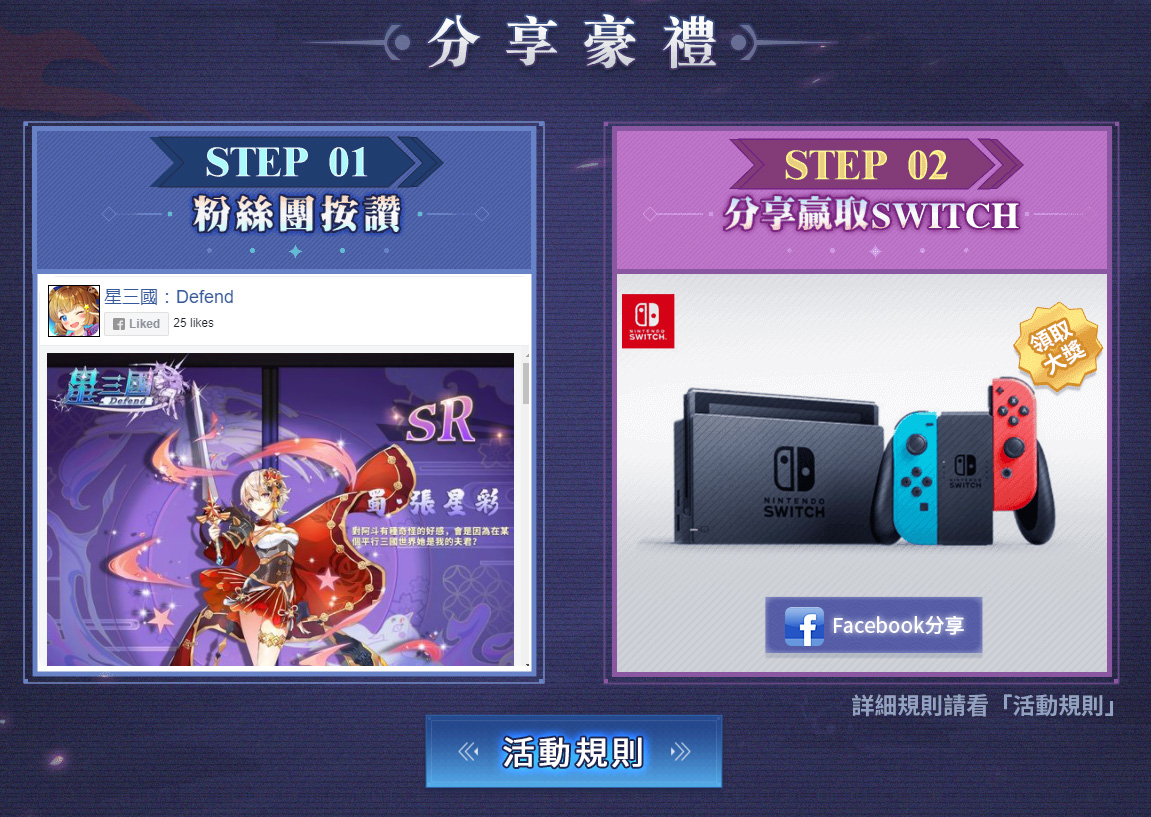 只要完成上述預約步驟,並於活動期間內到《星三國:Defend》粉絲團協助按讚,並在活動貼文中留言並TAG一名好友,最後再公開分享此則貼文,公測開放之後即有機會贏得限定版SWITCH!