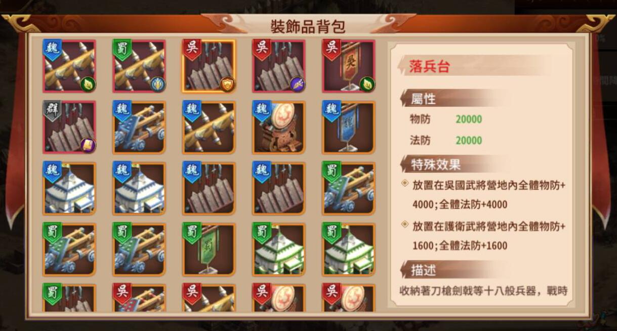 軍營內的裝飾品會為駐營武將、全體武將帶來大量的屬性加成