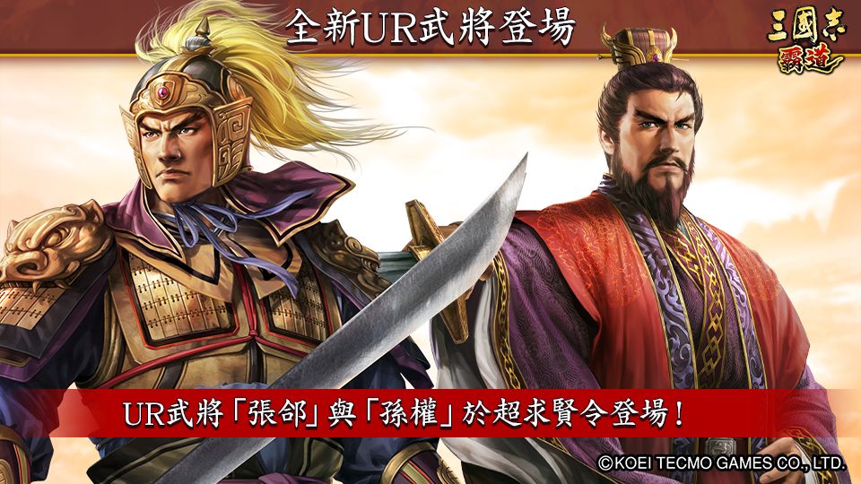 臺灣光榮特庫摩宣布,唯一由三國志系列之本家日本光榮特庫摩重磅推出MMO戰略模擬手機遊戲『三國志 霸道』已於10/25(二)完成遊戲更新,推出最新最高稀有度的UR武將-UR張郃、UR孫權及新SSR覺醒武將登場。