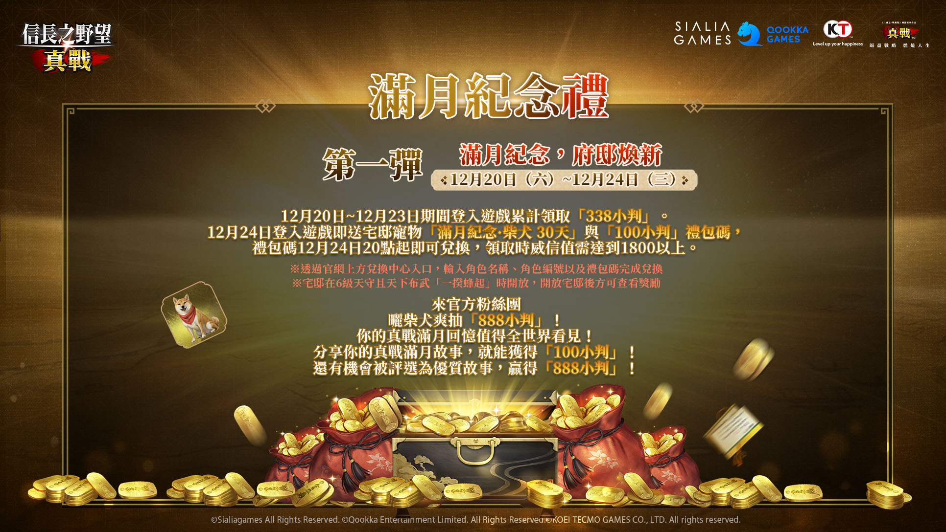 歡慶《信長之野望 真戰》公測滿月,感謝所有領主一路以來對遊戲的支持與陪伴,官方特別準備誠意十足的「滿月紀念禮」,12月20日-12月23日期間登入遊戲可累計領取「338小判」,12月24日登入遊戲即送宅邸寵物「滿月紀念・柴犬30天」與「100小判」禮包碼。