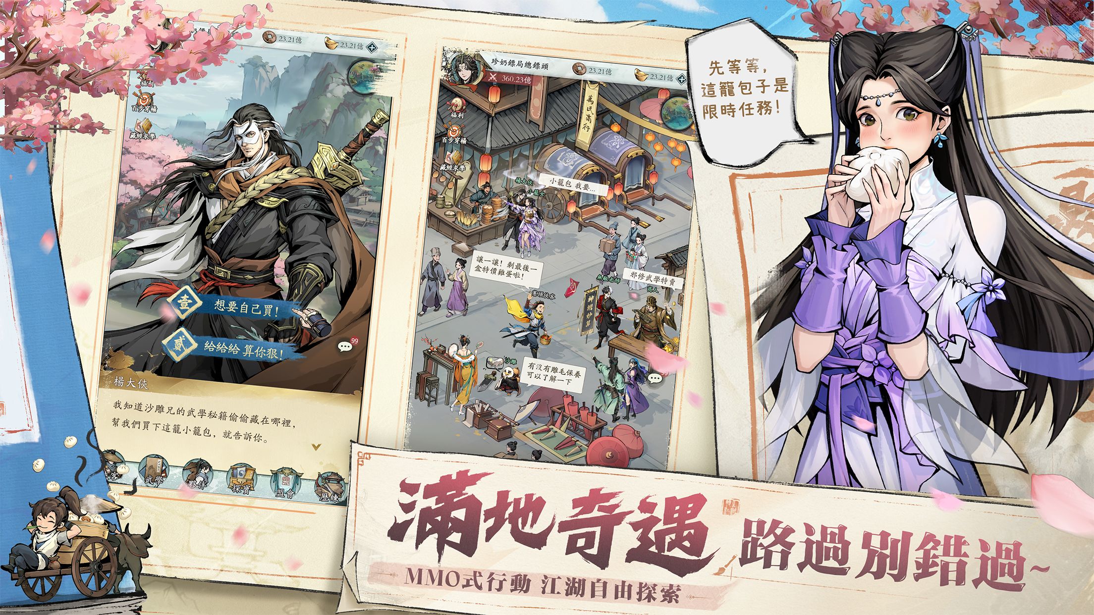 話雖如此,這異世江湖來都來了,肯定要好好體驗一下江湖奇遇!遊戲採用MMO式自由行動模式,玩家可以自由隨心探索。在這個「不正經」的江湖處處暗藏玄機,轉角可能就會遇到未知的驚喜!或許會一不小心碰見雕兄在偷偷了解雕毛保養套餐;因為幫楊大俠買了籠小籠包,竟得知曠世武學秘籍的下落;隔壁街還有一個無敵老師在暗中購入邪修武學秘籍……在這裡,只有想不到,沒有遇不到的奇遇,快來觸發你的江湖奇遇吧!